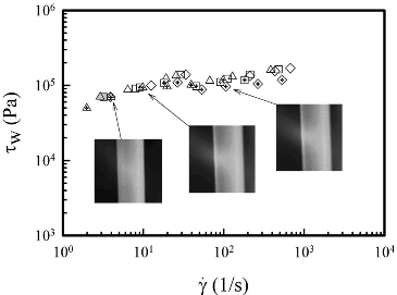 Investigations have been made on behaviors of complex fluids, such as wall slip, instability, parameter identification. The following figure shows an example.